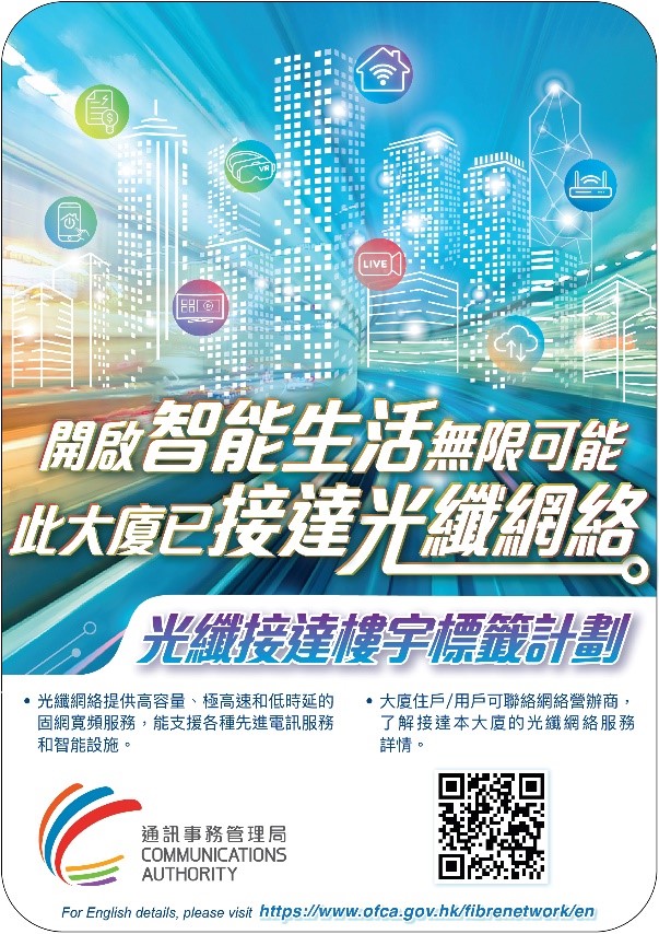 If the registration is successful, OFCA would provide the Designated Label for display in a prominent location in lobby/entrance of the building to publicize its technological superiority/in respect of access to the optical fibre network. Subject to the Conditions of Use, the Relevant Parties may download the softcopy of the Designated Label and reproduce it in any materials (including notices, newsletters and Internet websites) relevant to the building at their own cost.