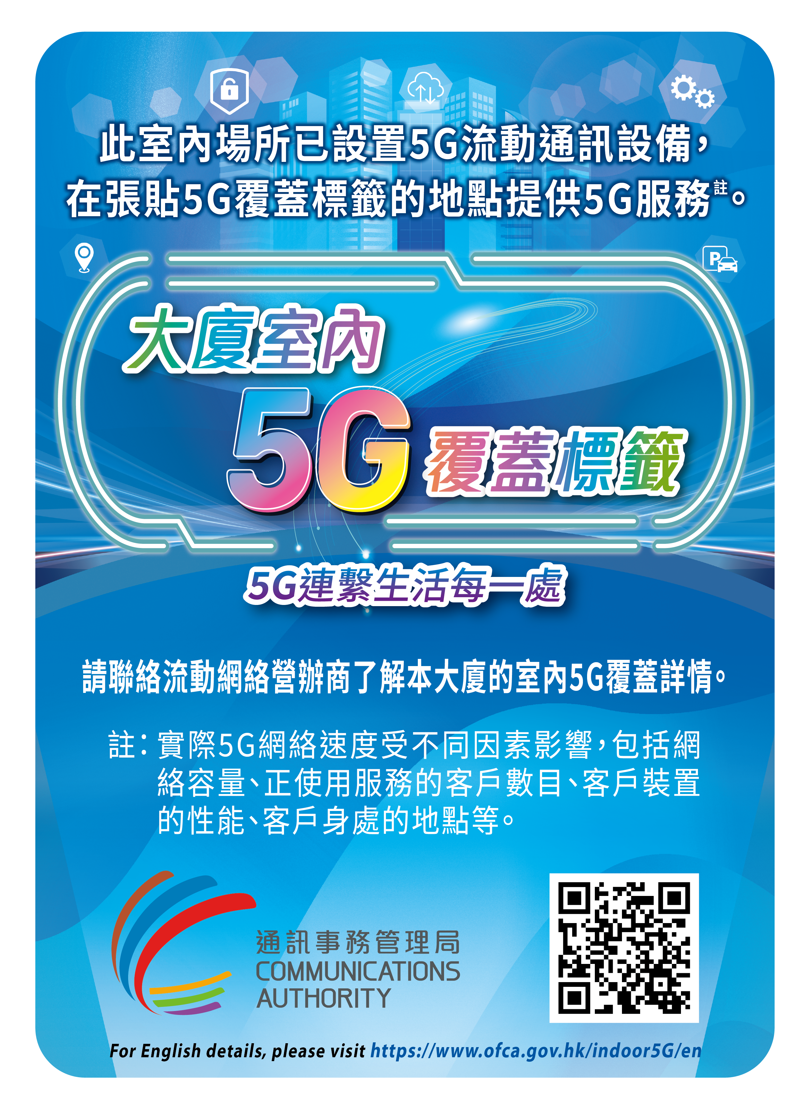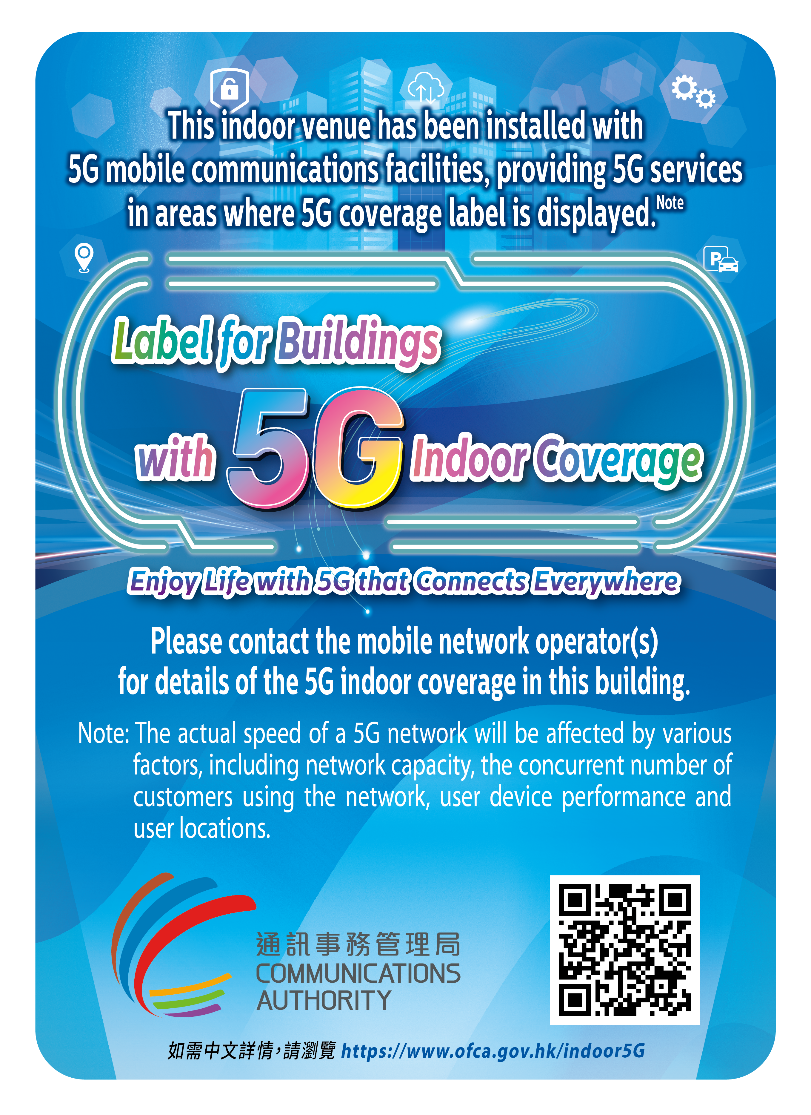 MNOs can make registration with OFCA when 5G mobile communications facilities are installed at the indoor common parts or locations of a building such as lobby, lifts, carpark, shops or basement for 5G indoor coverage. OFCA will set up a Register and update it regularly to inform the public about 5G indoor coverage information. MNOs may collaborate with the venue managers to post the 5G Labels (as shown below) at places where 5G coverage is available at those common parts or locations Note.