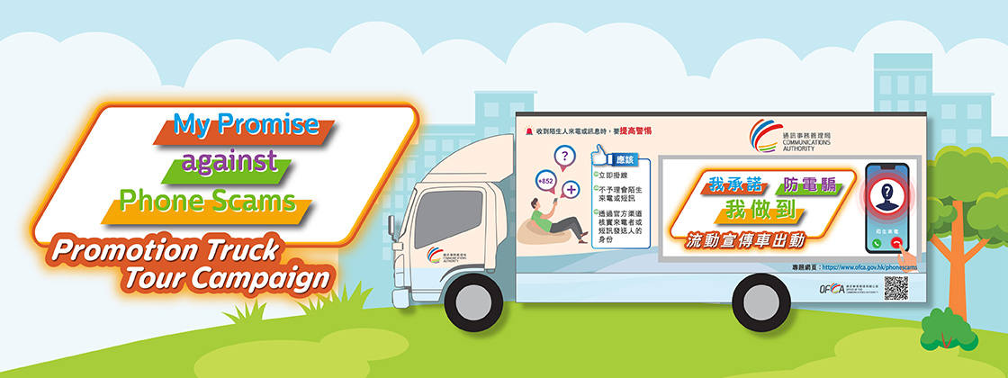 The Communications Authority has launched a promotion truck tour campaign themed "My Promise against Phone Scams" in order to further promote anti-deception messages on phone scams. The campaign aims to remind members of the public to always stay vigilant against unknown telephone calls and short messages, and that to avoid being scammed, they should under no circumstances disclose their personal or account information or transfer money to unknown callers and senders of short messages. The promotion truck will tour around to and park at different locations in all 18 districts of Hong Kong from 11 December to 22 December 2023 for 12 days.