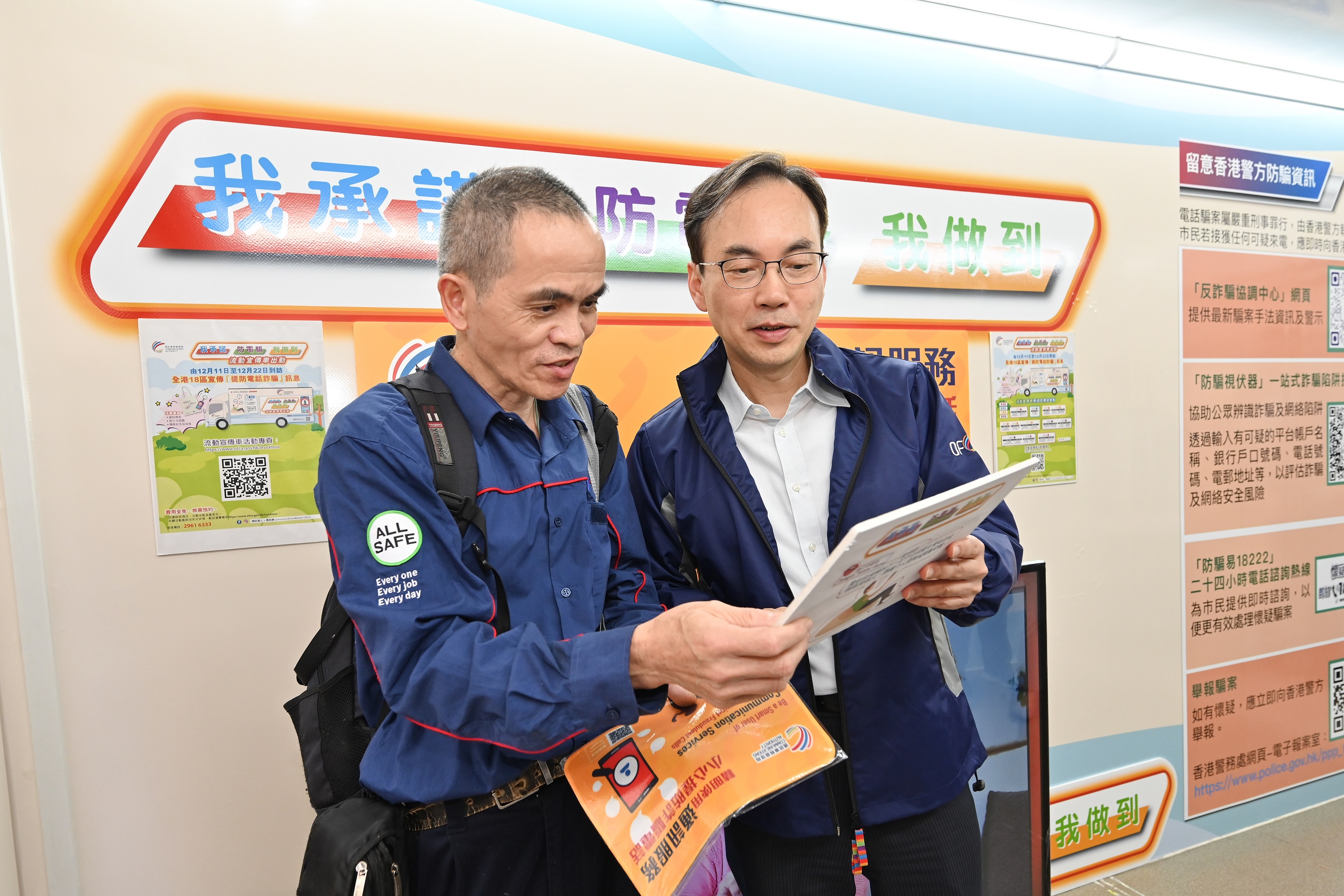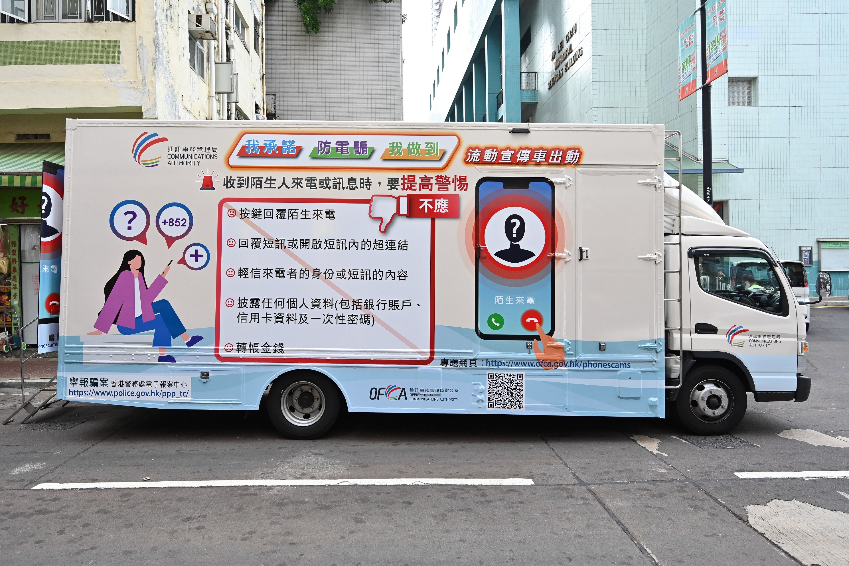 The Communications Authority (CA) today (11 December 2023) launched a promotion truck tour campaign themed "My Promise against Phone Scams" to enhance publicity against telephone scams. The promotion truck, featuring games and exhibits, will tour Hong Kong's 18 districts from today to 22 December.