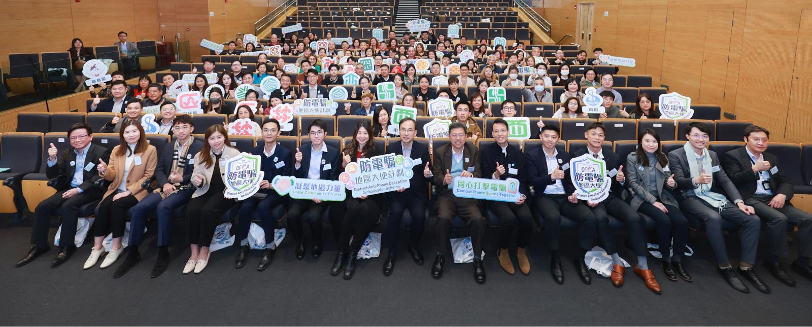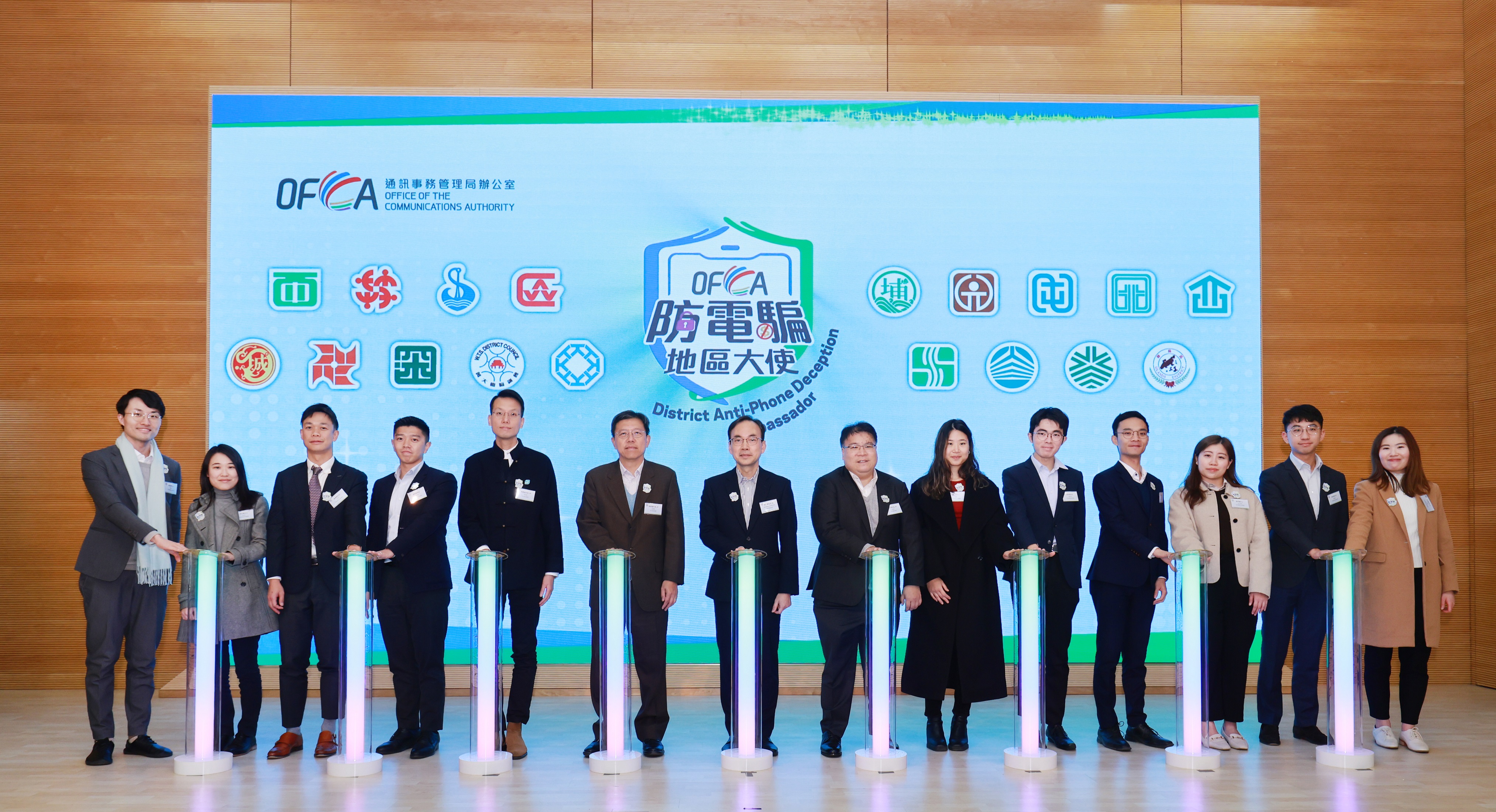 The Office of the Communications Authority (OFCA) today (16 January 2025) held the Launch Ceremony of the District Anti-Phone Deception Ambassador Scheme, with nearly 300 District Council (DC) members and staff members of their ward offices from all 18 districts in Hong Kong appointed as District Anti-Phone Deception Ambassadors to promote anti-phone scam messages to the public through concerted efforts at the community level more extensively.