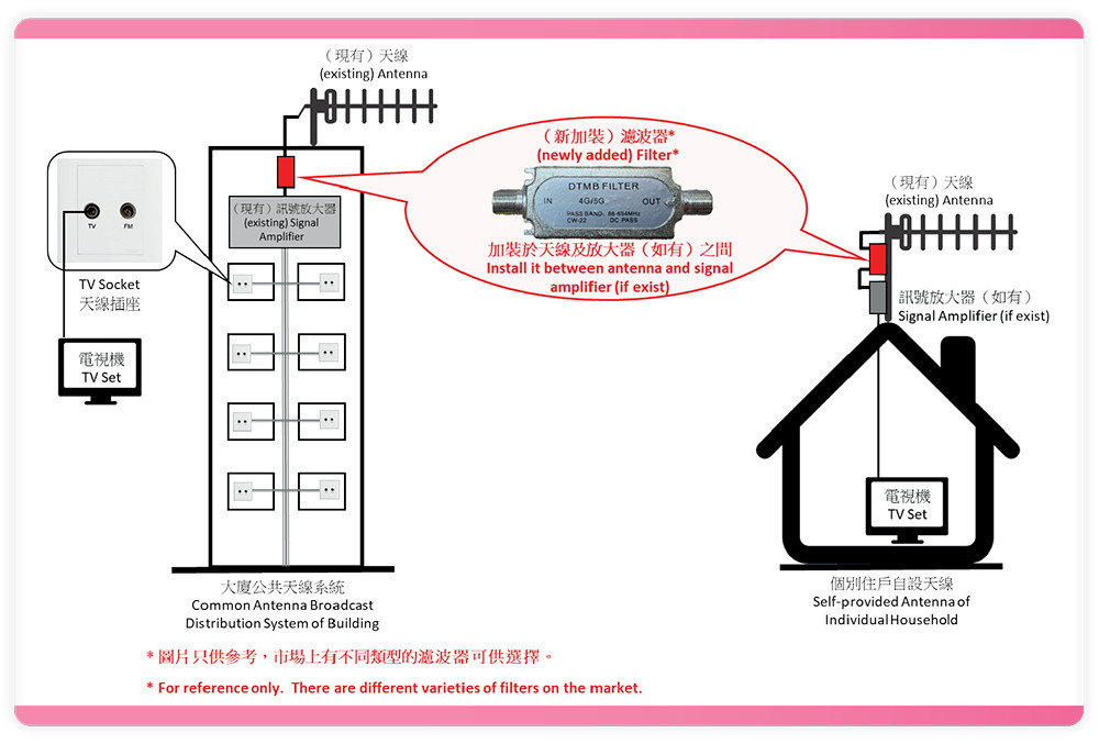 - Following the implementation of full digital TV broadcast in Hong Kong, the free TV programme channels operating in the 600/700 MHz bands were migrated to the 500 MHz band on 1 December 2021, thereby freeing up relevant spectrum for provision of high value-added mobile telecommunications services, such as 5G service. As the spectrum in the 700 MHz band was used for television broadcast in the past, the common antenna broadcast distribution system of a building / self-provided antenna of individual households (collectively known as antenna system) may still be able to receive signals in that particular band.