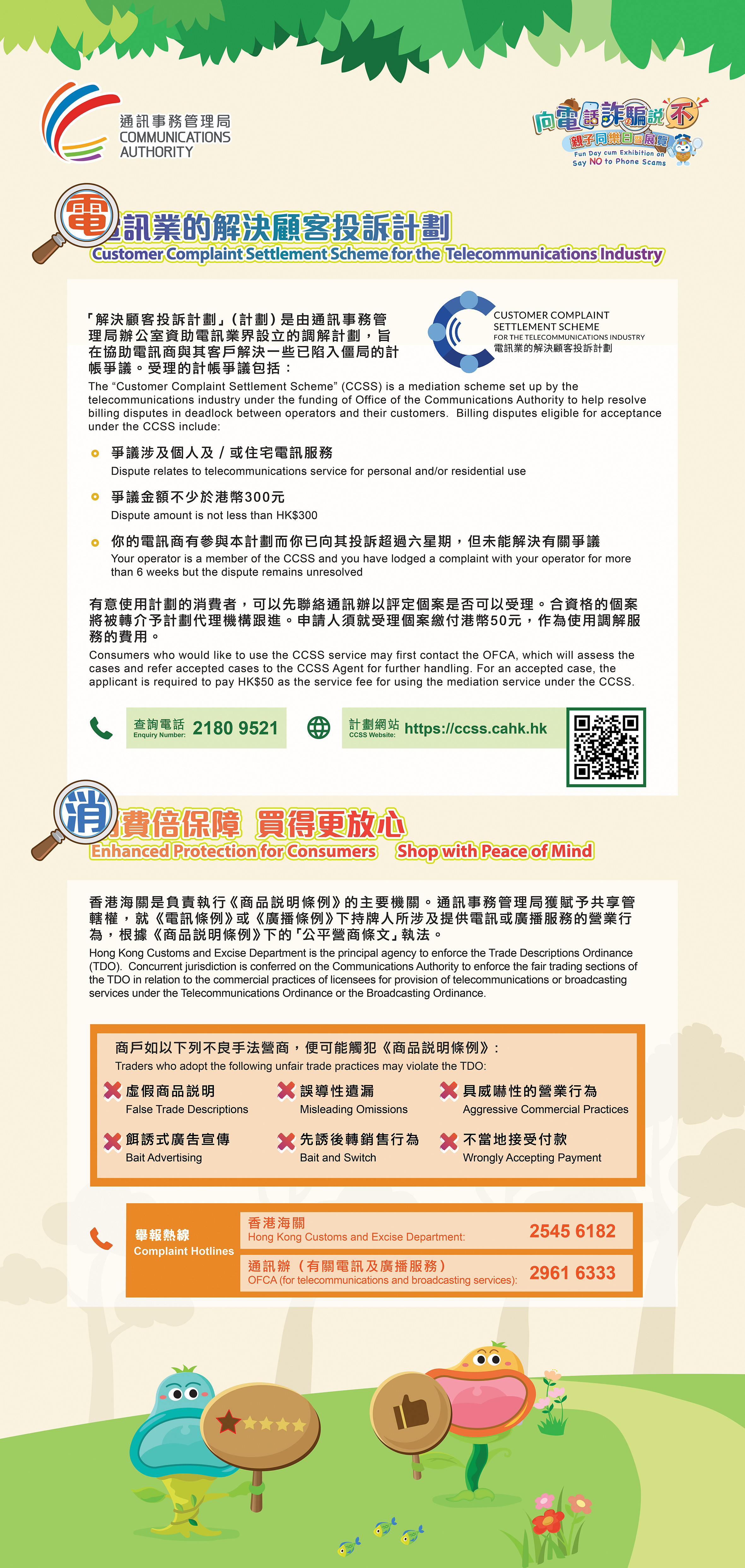 OFCA (for telecommunications and broadcasting services): 2961 6333