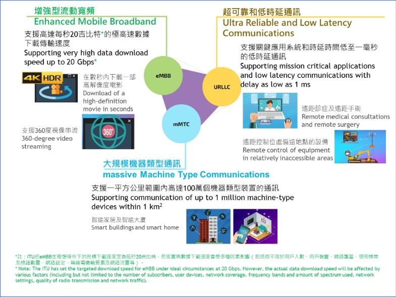 * The International Telecommunication Union (ITU) has set the targeted download speed for eMBB under ideal circumstances at 20 Gbps. However, the actual data download speed will be affected by various factors (including but not limited to the number of subscribers, user devices, network coverage, frequency bands and amount of spectrum used, network settings, quality of radio transmission and network traffic).