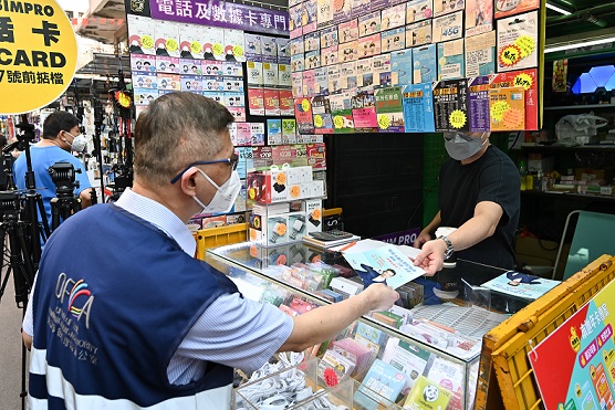 The Office of the Communications Authority (OFCA) conducted market surveillance this afternoon (April 11) in Sham Shui Po District to ensure effective implementation and enhance public awareness of the Real-name Registration Programme for Subscriber Identification Module (SIM) Cards. Photo shows OFCA's staff visiting a store selling pre-paid SIM cards in Apliu Street.